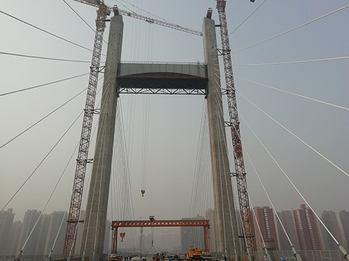 郑州农业快速通道工程规划为城市快速通道,为城市东西向大动脉,与东西向的陇海路,南北向的京广路、中州大道构成郑州城市交通大“井”字交通网架。全线西起西三环以西雄鹰路,东至中州大道以东金源东街,总长约13.255km。郑北大桥为全线控制性工程,需要跨越的是亚洲最大最繁忙的铁路编组站“郑州北站”,是国内同类桥梁中跨度最大、桥面最宽的独塔钢—混凝土结合梁斜拉桥,其中:主桥跨度为(221+221)m,梁体采用钢梁与混凝土桥面板结合梁,二者通过剪力钉结合;主塔为H型索塔,塔柱高达150m,设有上下两道横梁,下横梁为混凝土预应力结构,上横梁为钢箱梁结构,上横梁位于塔柱距地面高107.5m的位置。