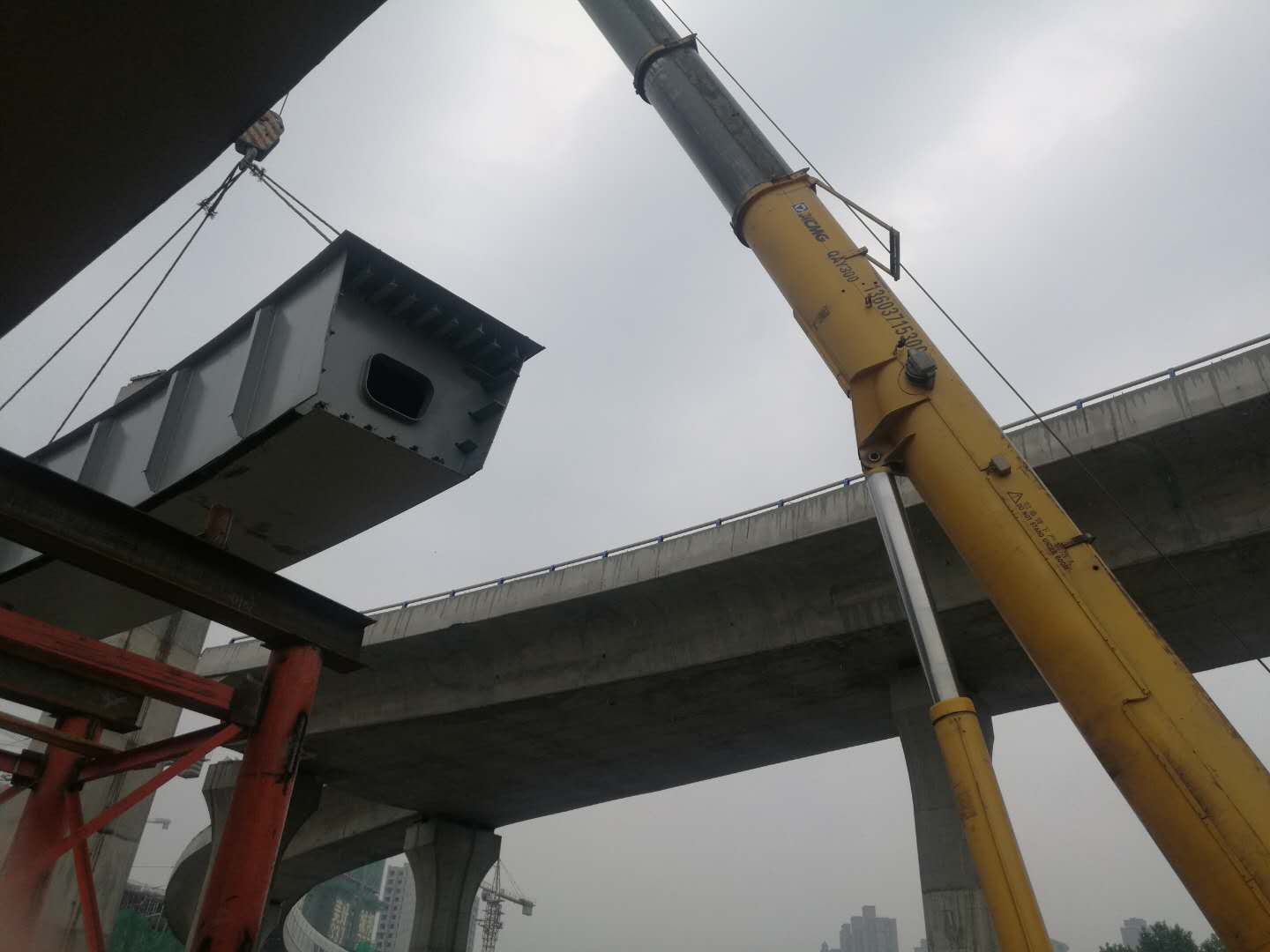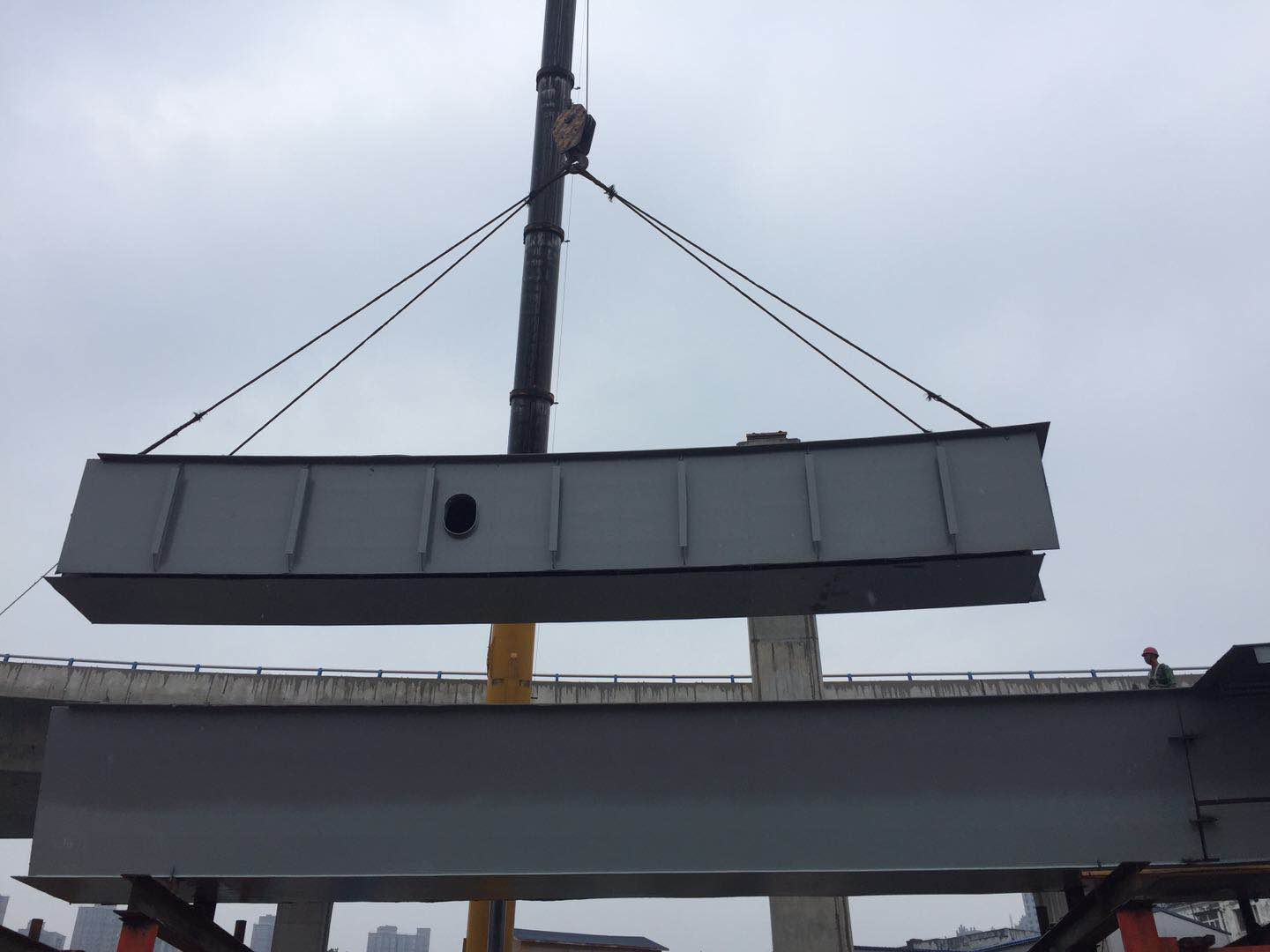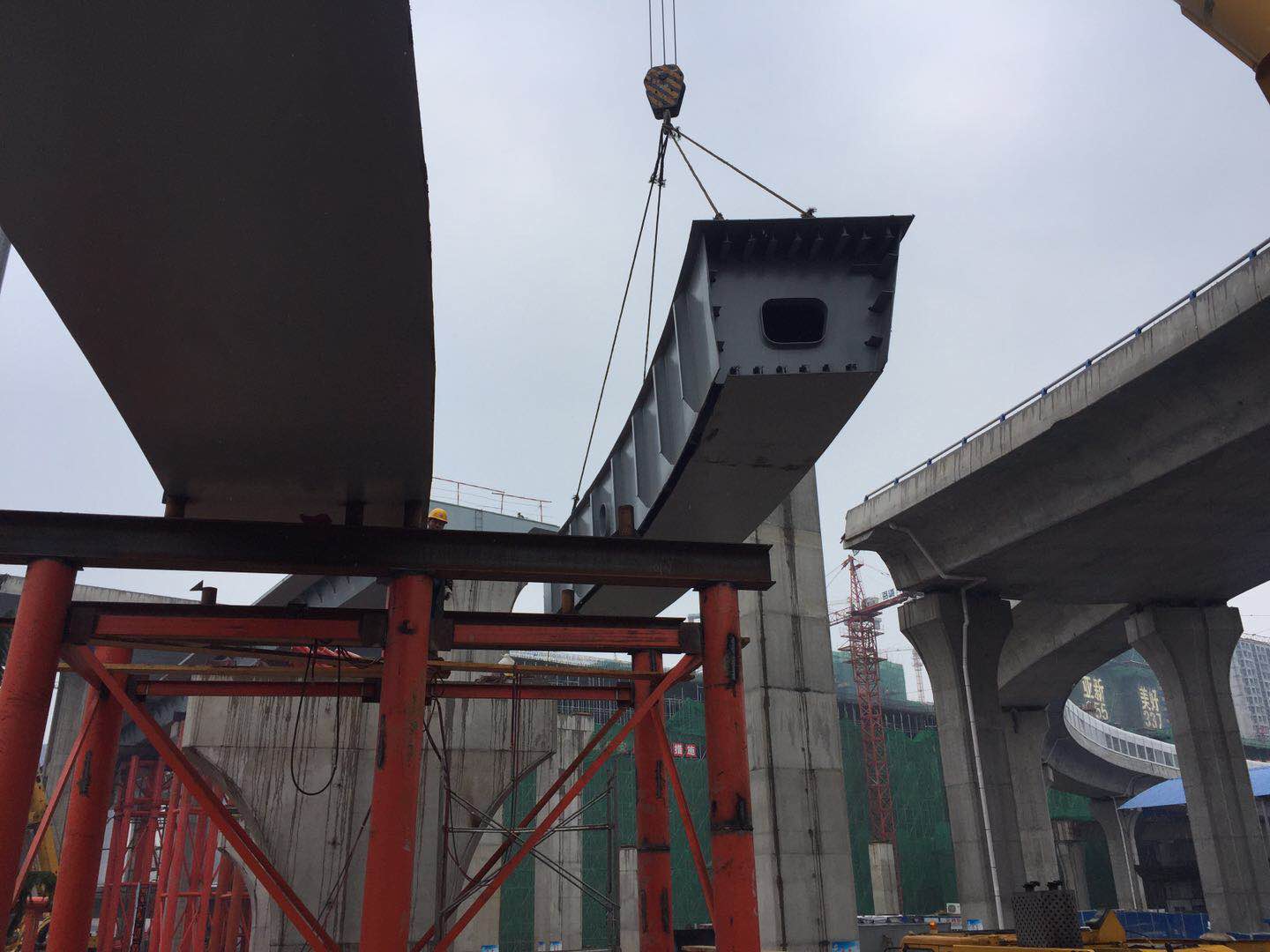 2018年5月18日下午,郑州市农业路快速通道工程匝道钢箱梁项目首块钢箱梁精确安装到位。