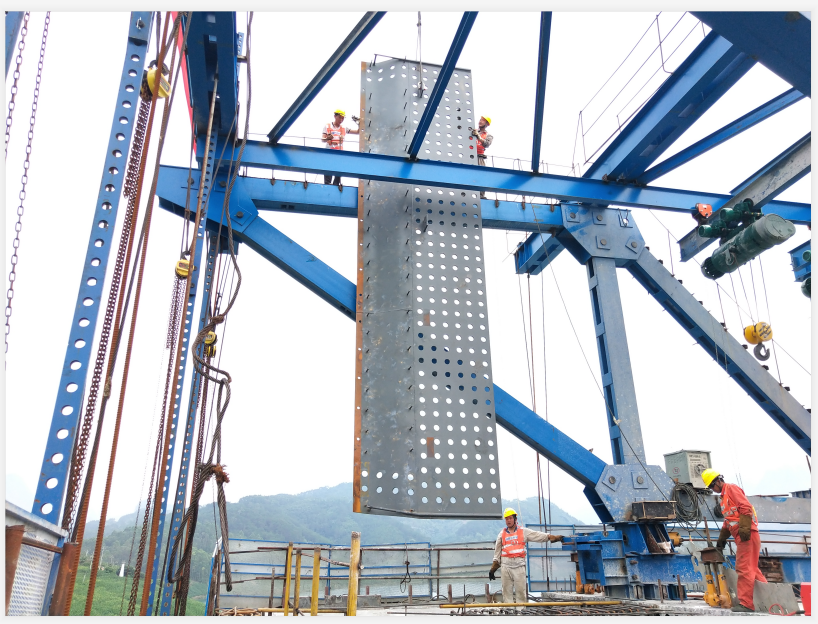 都巴高速都阳连接线红水河特大桥跨径布置92+172+92m。据了解,该桥是亚洲第二、国内在建跨度最大的波形钢腹板连续刚构桥,也是广西首座波形钢腹板箱梁桥。此次安装的是3号墩3#块波形钢腹板,宽2.1米、高8米、重达4吨。